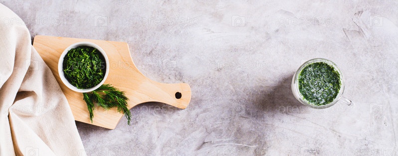 Стакан со свежим турецким айраном с укропом и зеленью на столе, вид веб-баннера