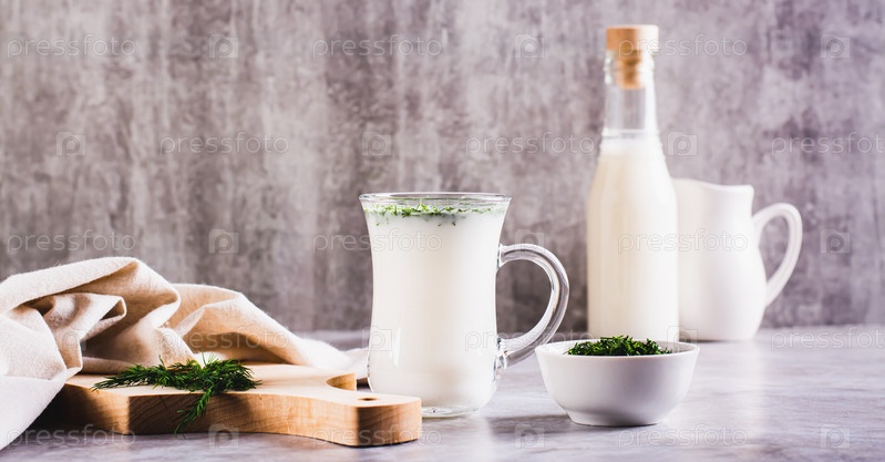 Айран домашний йогуртовый напиток с укропом в стакане на столе веб-баннер
