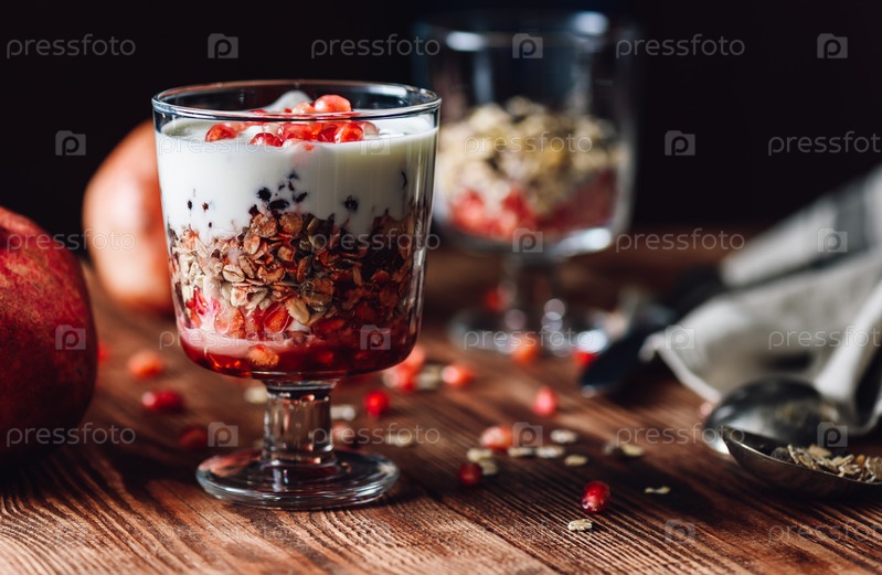 Гранатовое парфе с некоторыми ингредиентами на заднем плане. Серия о приготовлении полезного десерта с гранатом, гранолой, сливками и джемом