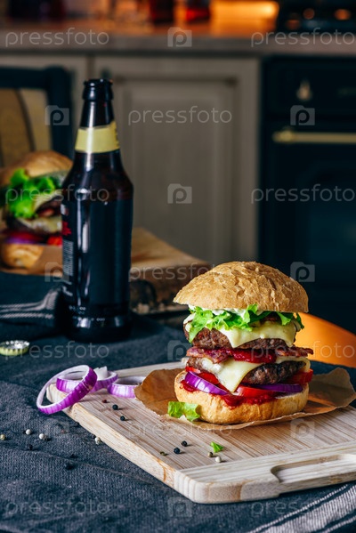 Чизбургер на разделочной доске с бутылкой пива