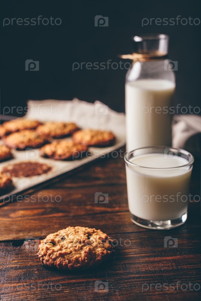 Овсяное печенье с изюмом и стаканом молока на завтрак. Некоторые печенья на пергаментной бумаге с бутылкой на заднем плане. Вертикальная ориентация