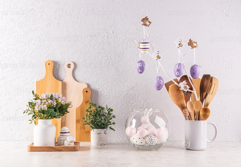 Украшаем кухонную столешницу к празднику Пасхи. Кухонная деревянная посуда, растения в горшках, ветка с сиреневыми яйцами. Передний план. Эко стиль