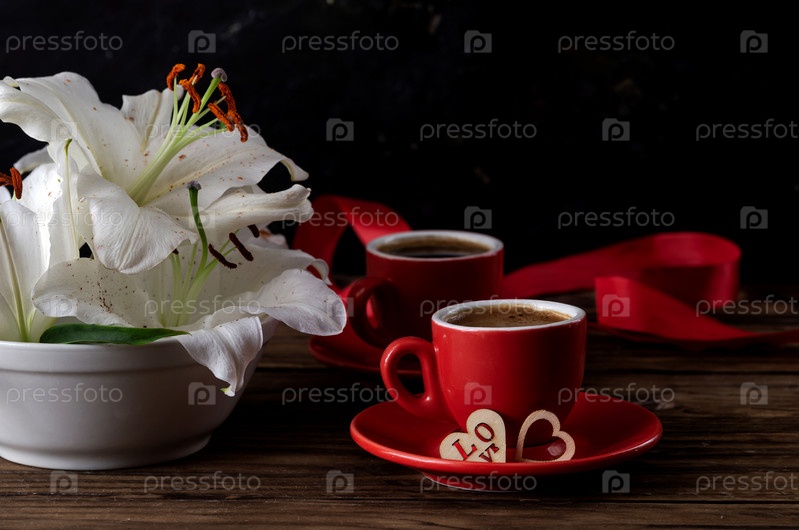 Натюрморт ко Дню святого Валентина с лилиями и кофе