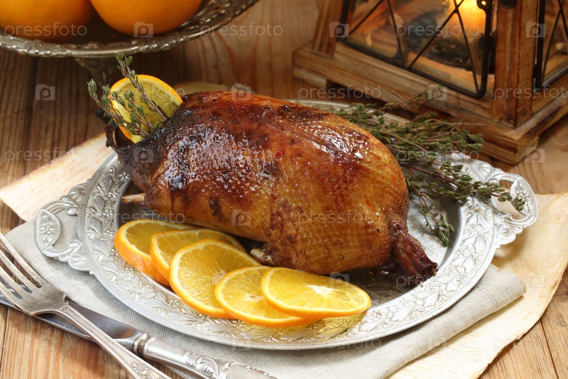 Утка с апельсинами и соусом на железном блюде