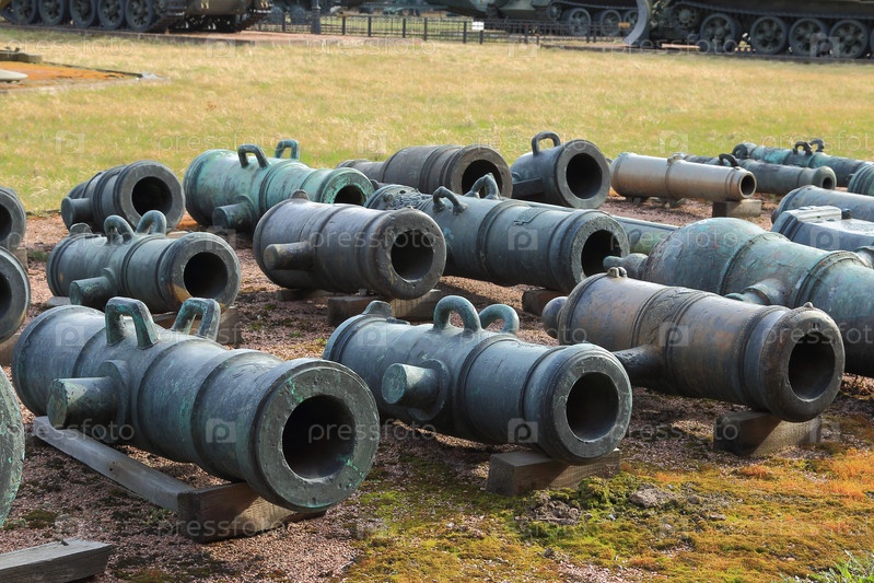 Старинные бронзовые пушки на газоне. Музей артиллерии. Санкт-Петербург