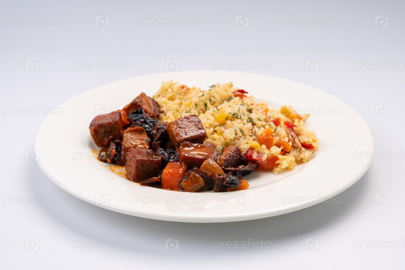 Ужин. Жареные ломтики баклажанов в соусе с рисом и овощами на белой тарелке и белом фоне