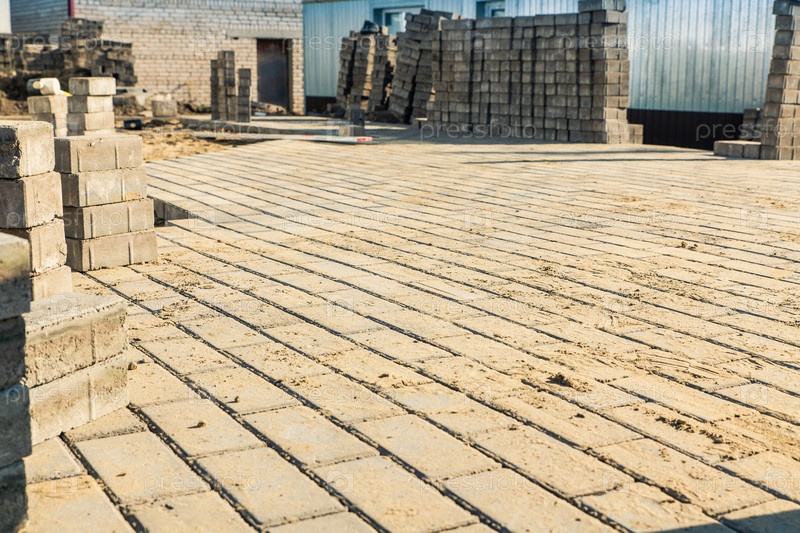 Укладка серых бетонных тротуарных плит на выровненный желтый песок