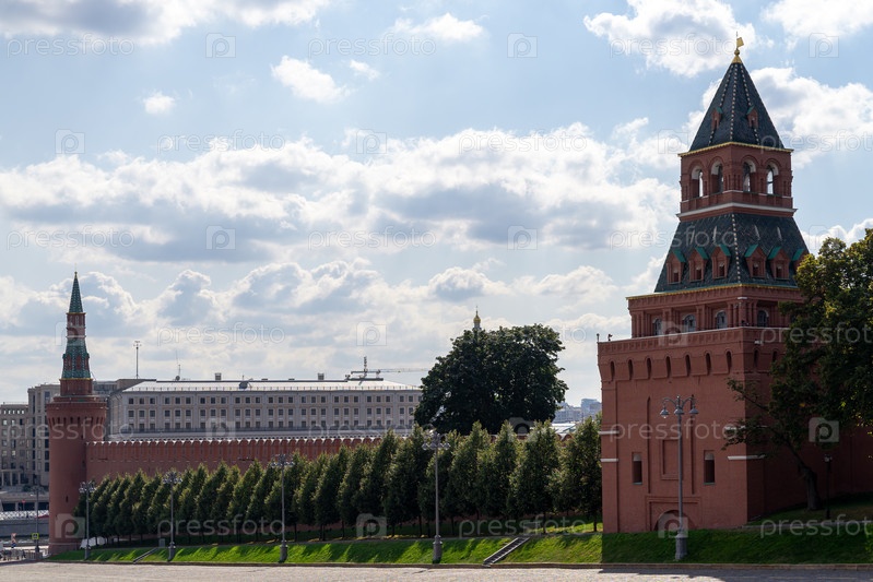 Константино-Еленинскую и Беклемишевскую башни сфотографировали на фоне голубого облачного неба
