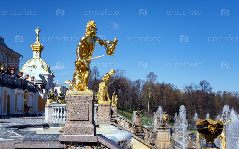 Вид на фонтанный комплекс Петергофского дворца в мае