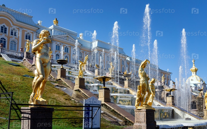 Вид на фонтанный комплекс Петергофского дворца в мае