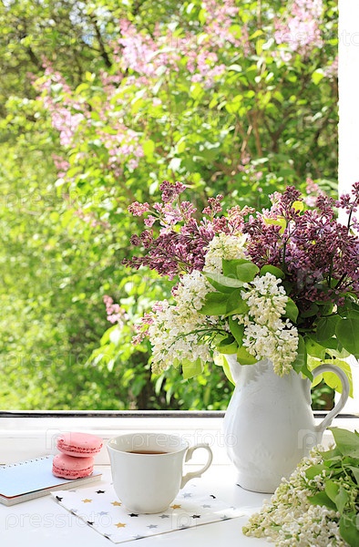 Абстрактная цветочная композиция, домашний интерьер с красивыми весенними сиреневыми ветвями в вазе на солнечном окне, баннер, натюрморт с местом для текста, цветочная праздничная открытка,