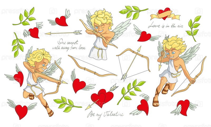 Набор векторных символов любви и Дня святого Валентина. Юный персонаж Купидона, лук, стрела, летающие сердца, зеленые листья, рукописные цитаты для дизайна поздравительных открыток, приглашений и подарочных бирок