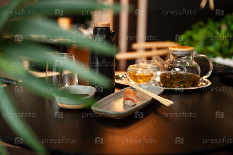 Татаки из тунца Нигири на тарелке на столе в суши-баре