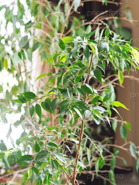 Комнатное взрослое растение фикус Бенджамина возле окна в частном доме