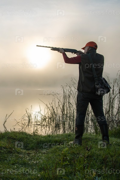Охотник охотится на водоплавающую дичь ранним утром на реке, осеняя охота на уток