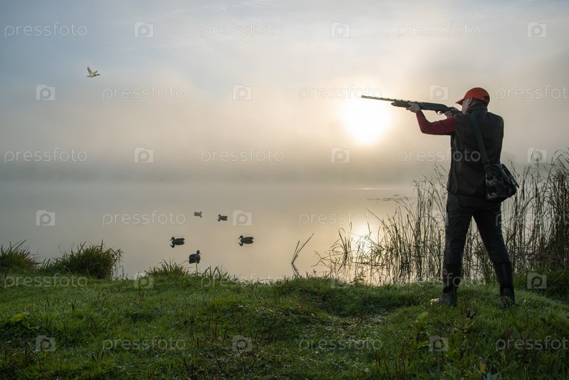 Охотник стреляет в летящую дикую утку. осеняя охота на уток,