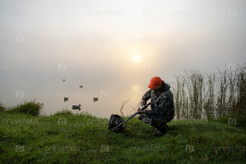 Охотник заряжает ружье для охоты на уток на берегу озера на рассвете