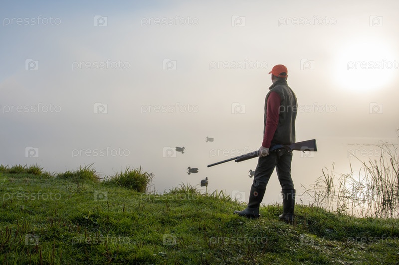 Охотник с ружьем охотится на уток осенью на озере, охота на водоплавающую дичь на рассвете