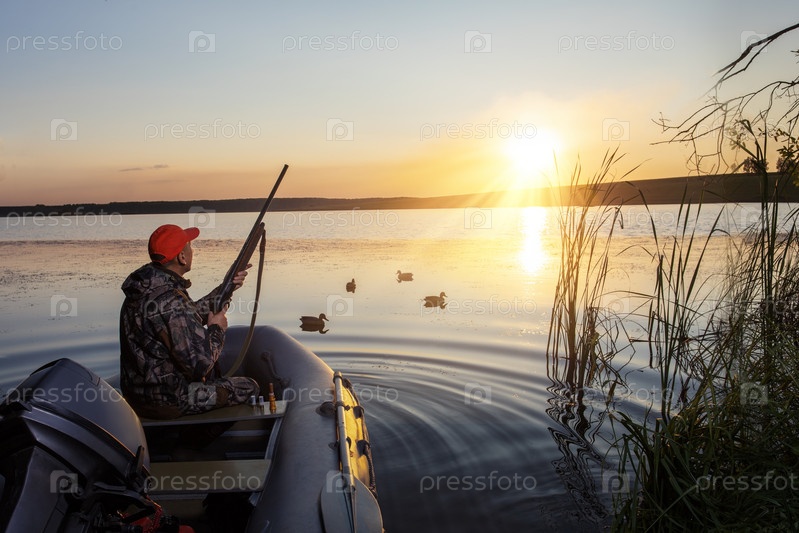 Охотник с ружьем сидит в лодке охотиться на уток ранним утром, охота на водоплавающую дичь осенью