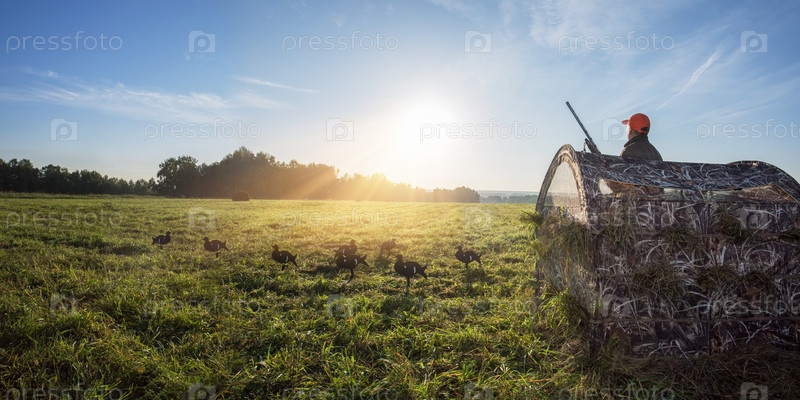Охотник на природе на рассвете. Охотник в замаскированной охотничьей шторке. Баннер с местом для копирования