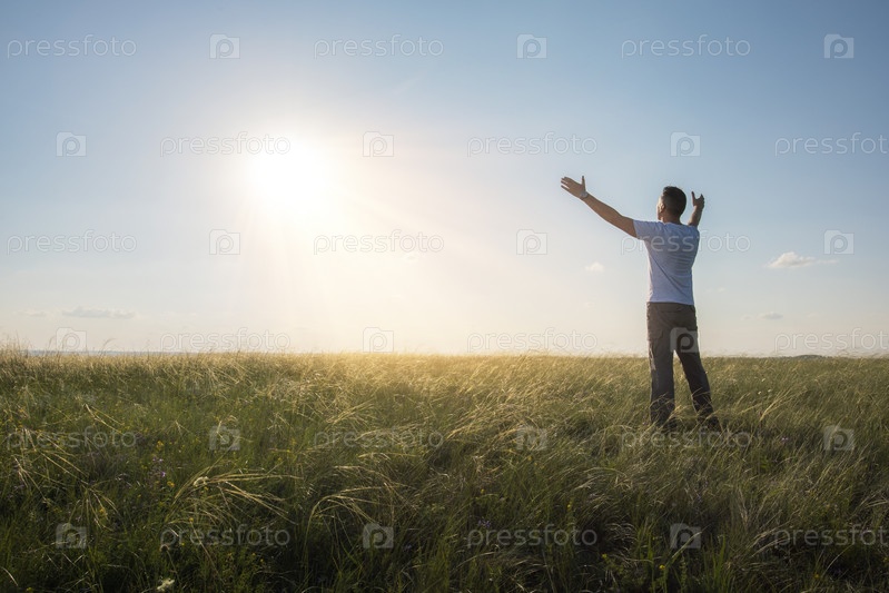 Счастливый человек поднял руки на закате. Гармония человека на свежем воздухе с природой