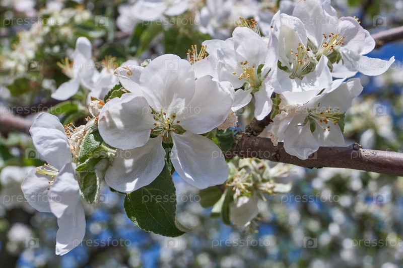 Цветы яблони на фоне кроны дерева и голубого неба. В саду цветет яблоня. Весна