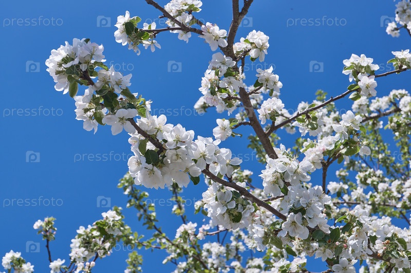 Цветы яблони на фоне кроны дерева и голубого неба. В саду цветет яблоня. Весна