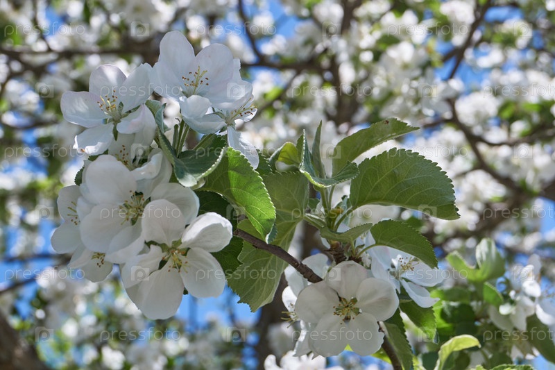 Цветы яблони на фоне кроны дерева и голубого неба. В саду цветет яблоня. Весна