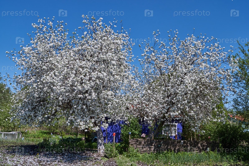 Цветы яблони на фоне кроны дерева и голубого неба. В саду цветет яблоня. Весна