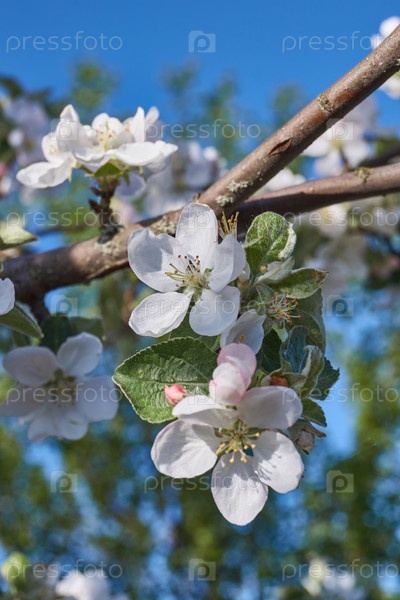 Цветы яблони на фоне кроны дерева и голубого неба. В саду цветет яблоня. Весна