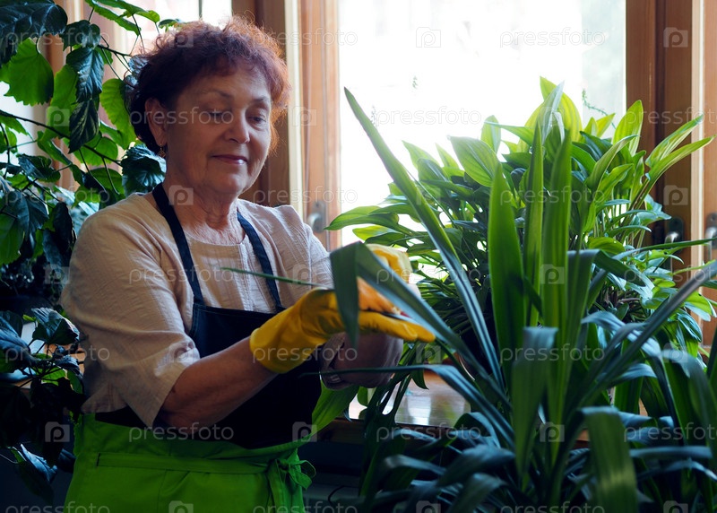 Пожилая женщина с любовью ухаживает и поливает домашние растения. Любимое занятие пенсионера. Жизнь и быт пожилых людей