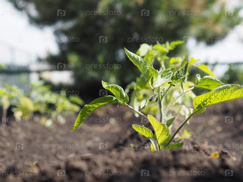 Естественный овощной зеленый фон. Молодые растения томатов растут на грядке на открытом воздухе. Концепция выращивания овощей