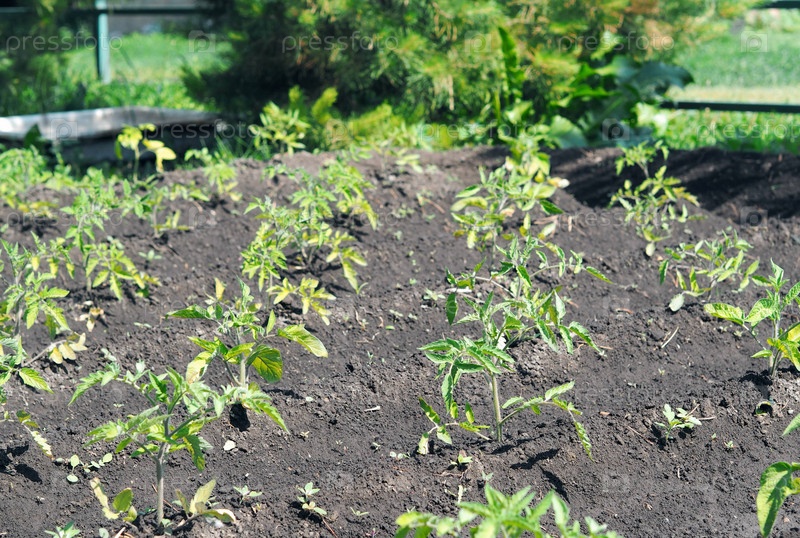 Естественный овощной зеленый фон. Молодые растения томатов растут на грядке на открытом воздухе. Концепция выращивания овощей