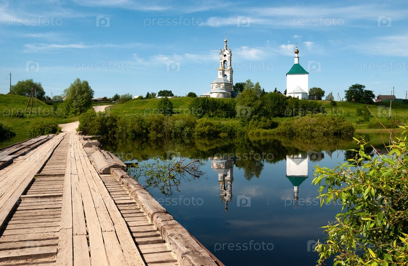 Деревянный мост, река Гусиная и два белокаменных храма - церковь Преображения Господня 1794 года и Никольская церковь 1771 года строгой кубической формы. Деревня Погост