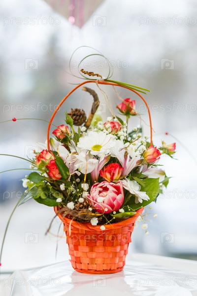 Букет цветов: розы, ромашки и пионы в круглой шляпке-коробочке. Композиция подарочная ваза из цветов на день святого Валентина, день матери, свадьбу, день рождения