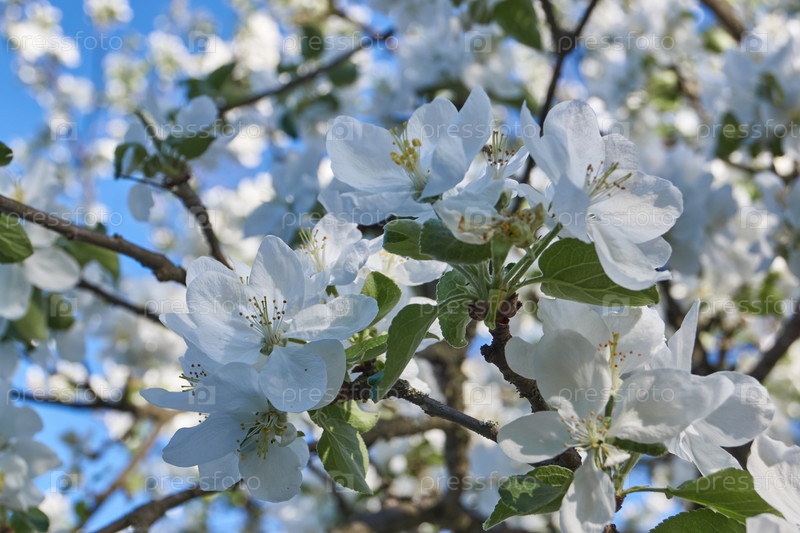 Цветы яблони на фоне кроны дерева и голубого неба. В саду цветет яблоня. Весна