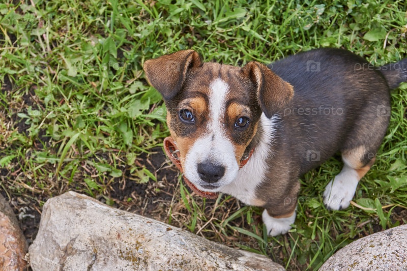 Щенок гуляет дома по двору и позирует для фотографии
