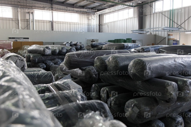 Рулоны черной ткани и текстиля на заводском складе