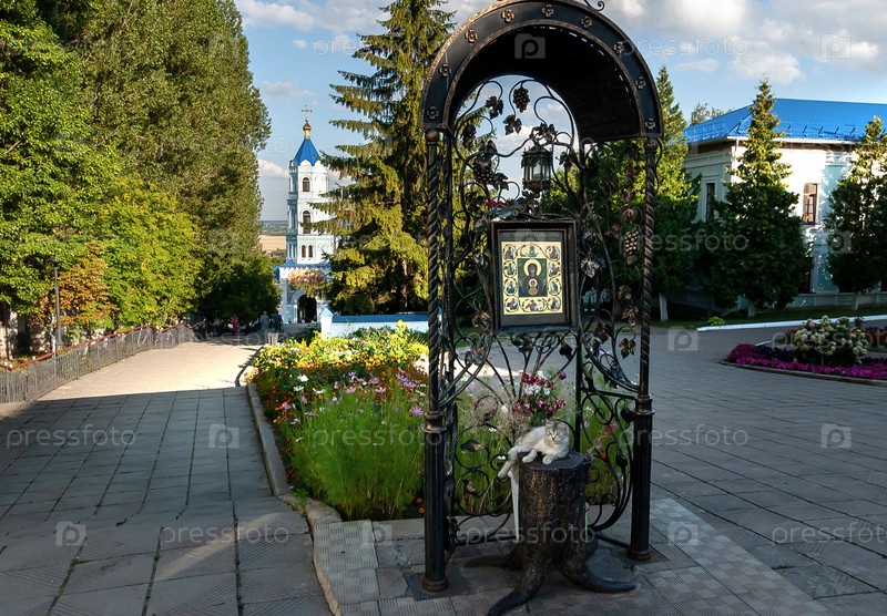 Монастырь «Курская Коренная пустынь». Паломников приветствуют икона Божией Матери «Чудотворная» и кот. Курская область. деревня Свобода