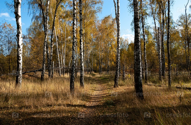 Солнечное утро в березовом осеннем лесу, тропа уходит вглубь леса. Московская область