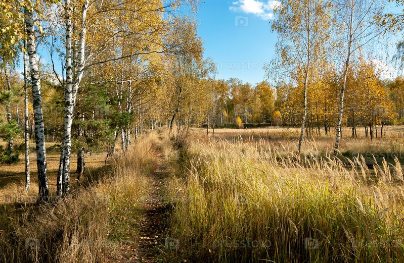 Осень, Тропа в редком березовом лесу. Игра света и тени, трава и березы сияют золотом. Московская область