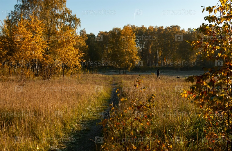 Путь через солнечный луг с высокой желтой травой. Утренняя свежесть, прогулка с собакой. Московская область