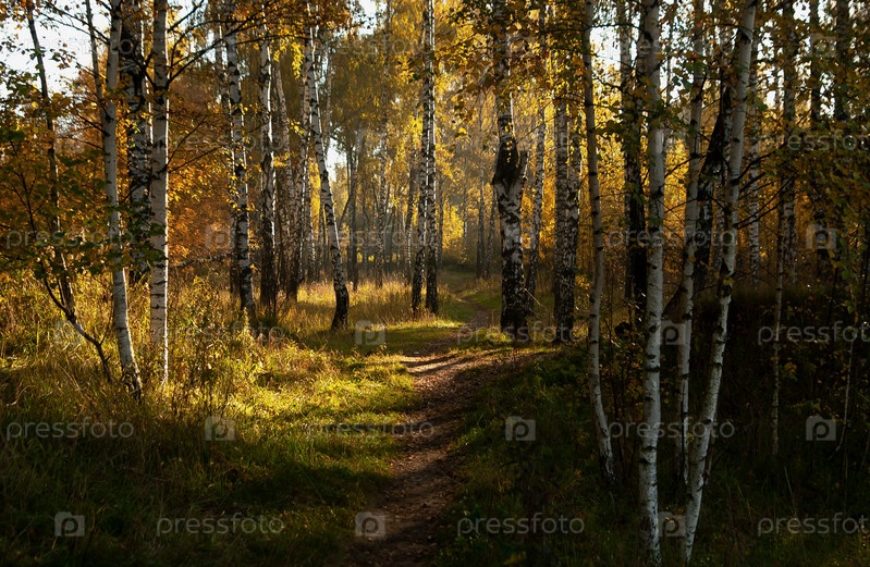 Березовый весенний лес, тропинка уходит вглубь леса, солнце подсвечивает желтую листву, длинные тени. Московская область