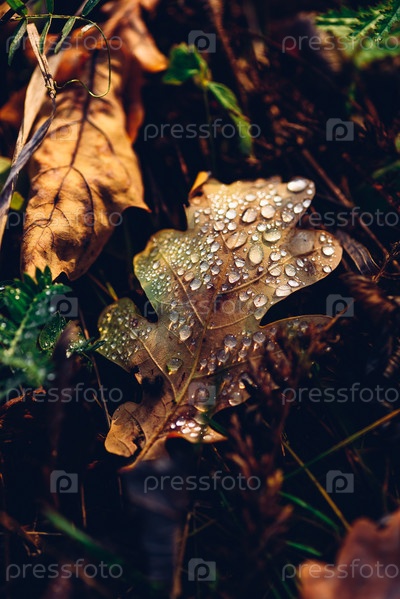 Осенний дубовый лист с каплями