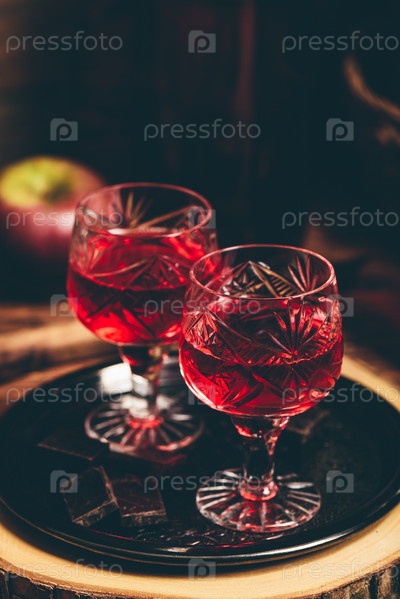 Стакан красного ликера с шоколадными батончиками