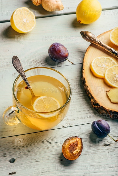 Чашка чая с лимоном, медом и имбирем