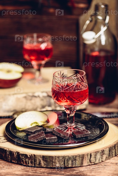 Стакан домашней наливки из красной смородины с ломтиками яблока и шоколадом