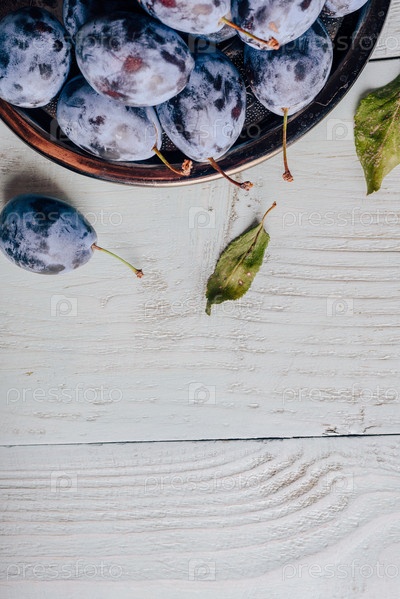 Сливы на тарелке на деревянной поверхности