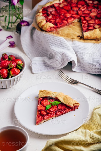 Кусочек сладкой свежеиспеченной клубничной галеты с листьями мяты на белой тарелке