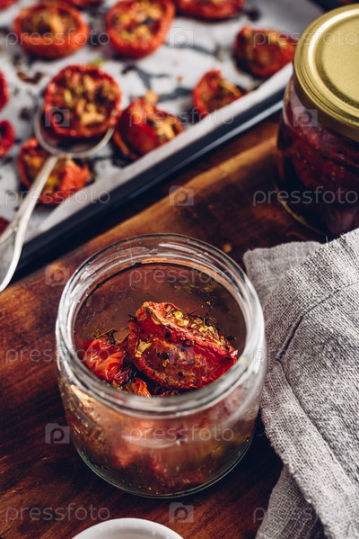 Свежеприготовленные вяленые помидоры с оливковым маслом и травами в стеклянной банке